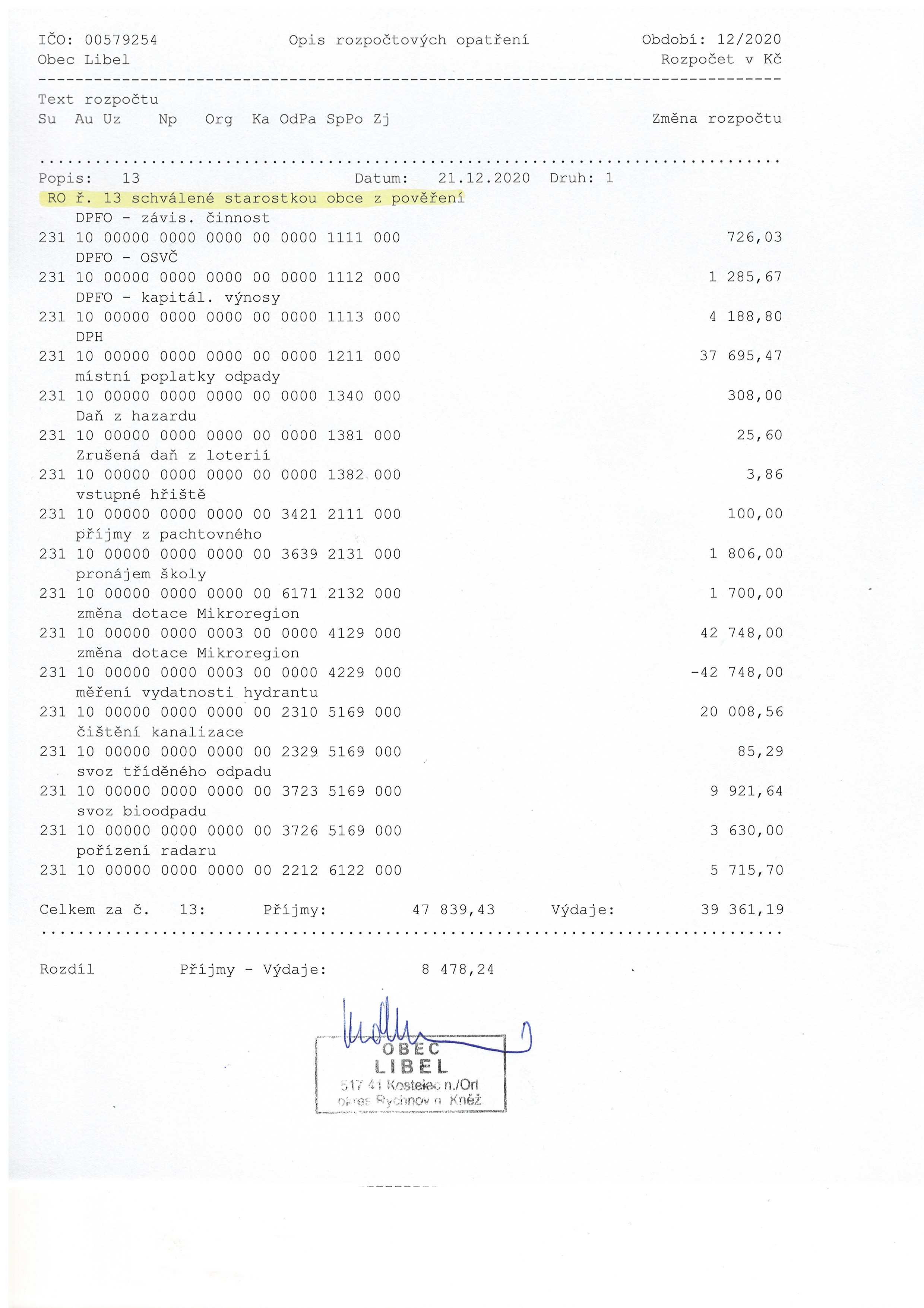 04.01 - 31.01.2021 Rozpočtové opatření č. 13