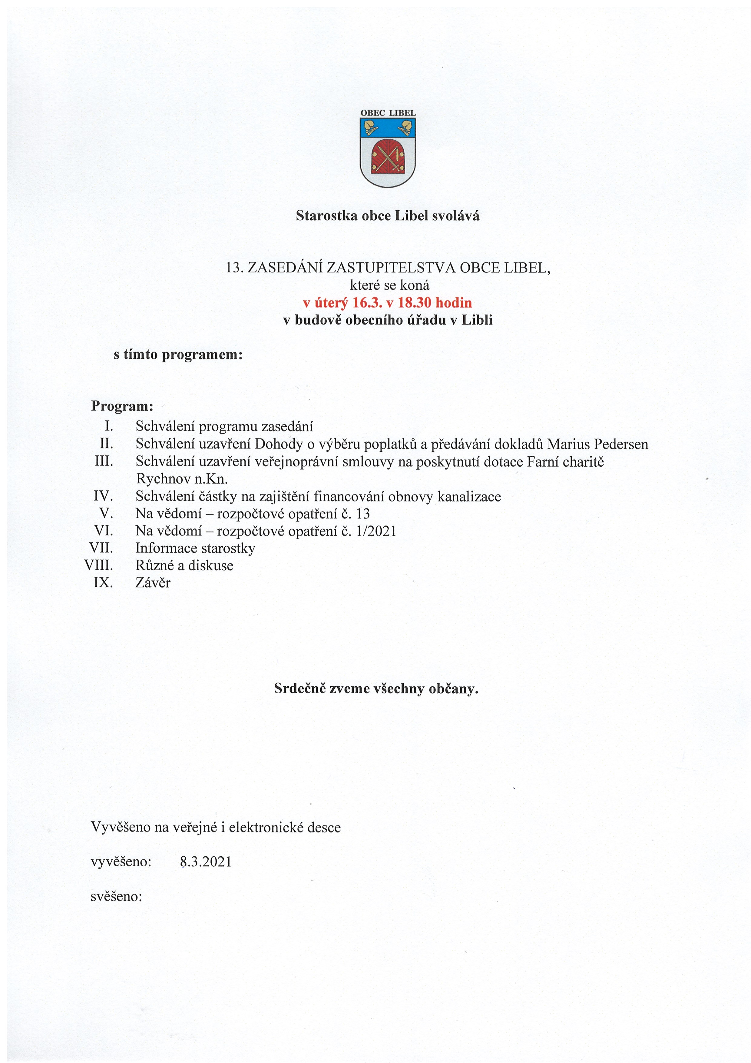 08.03 - 16.03.2021 Pozvánka na 13. zasedání zastupitelstva obce Libel