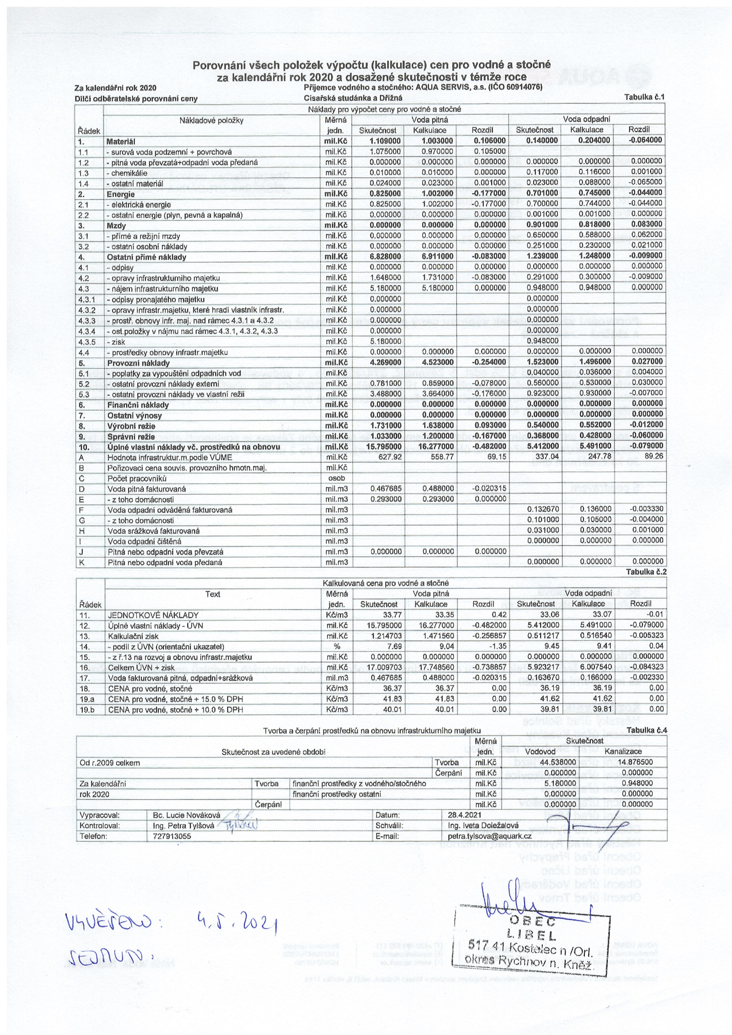 05.05 - 19.05.2021 Porovnání výpočtu cen pro vodné a stočné za r. 2020 a skutečnosti za r.2020 - Císařská studánka