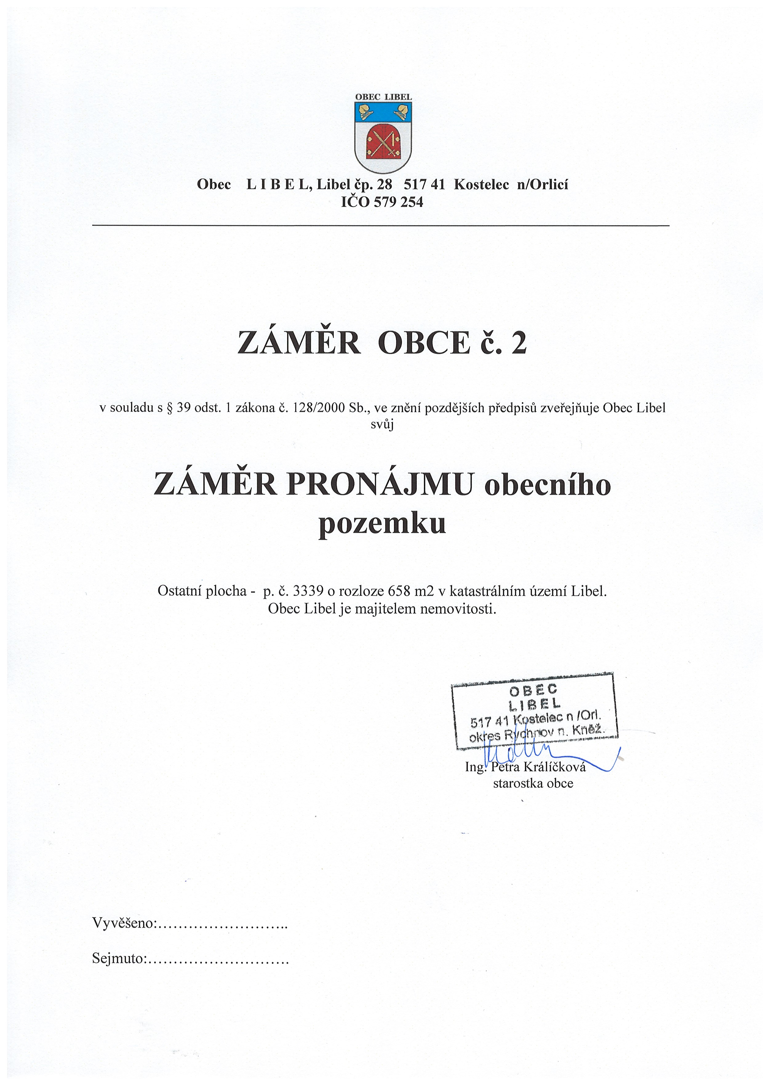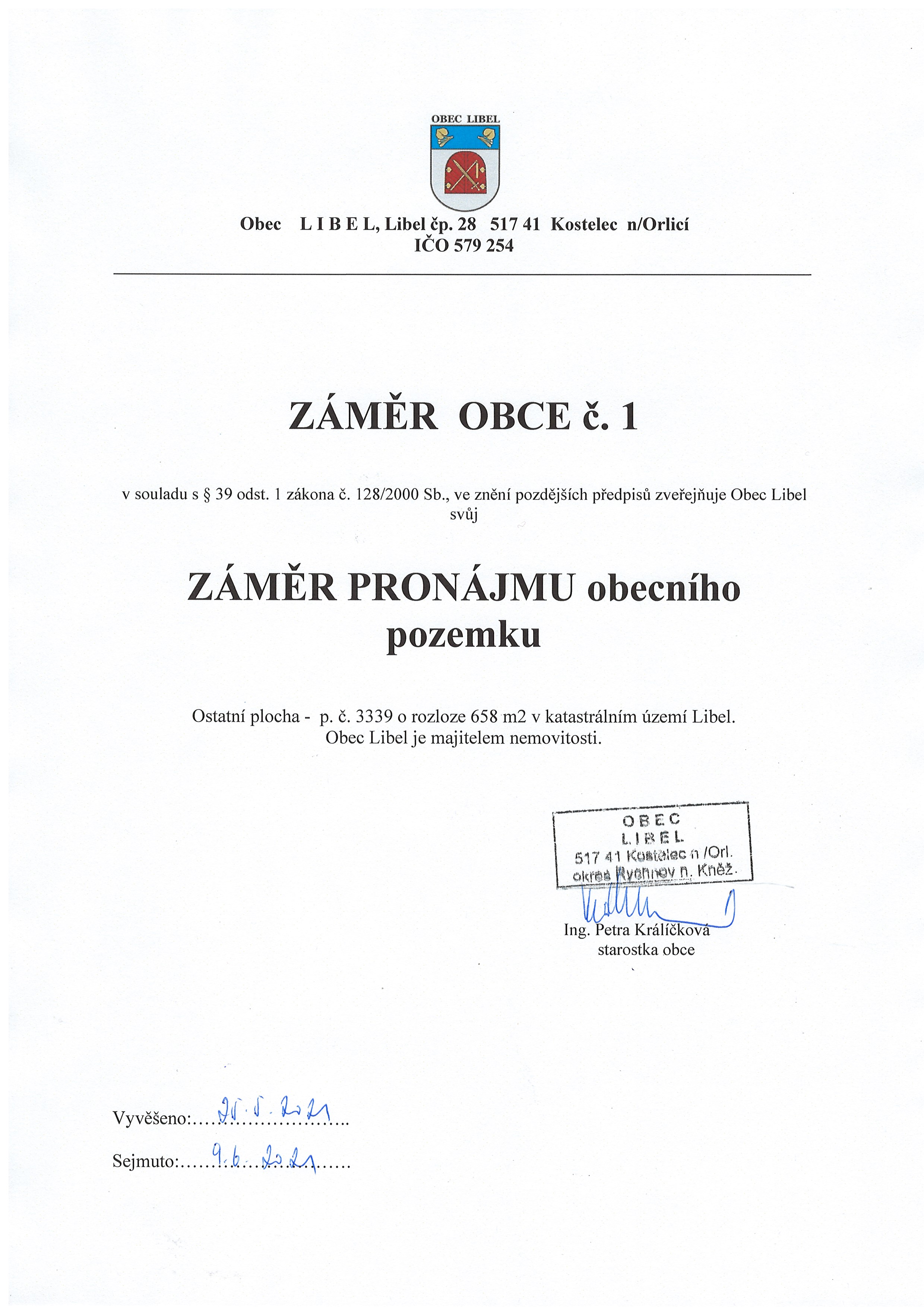 23.08 - 07.09.2021 Záměr obce č. 2 - záměr pronájmu obecniho pozemku