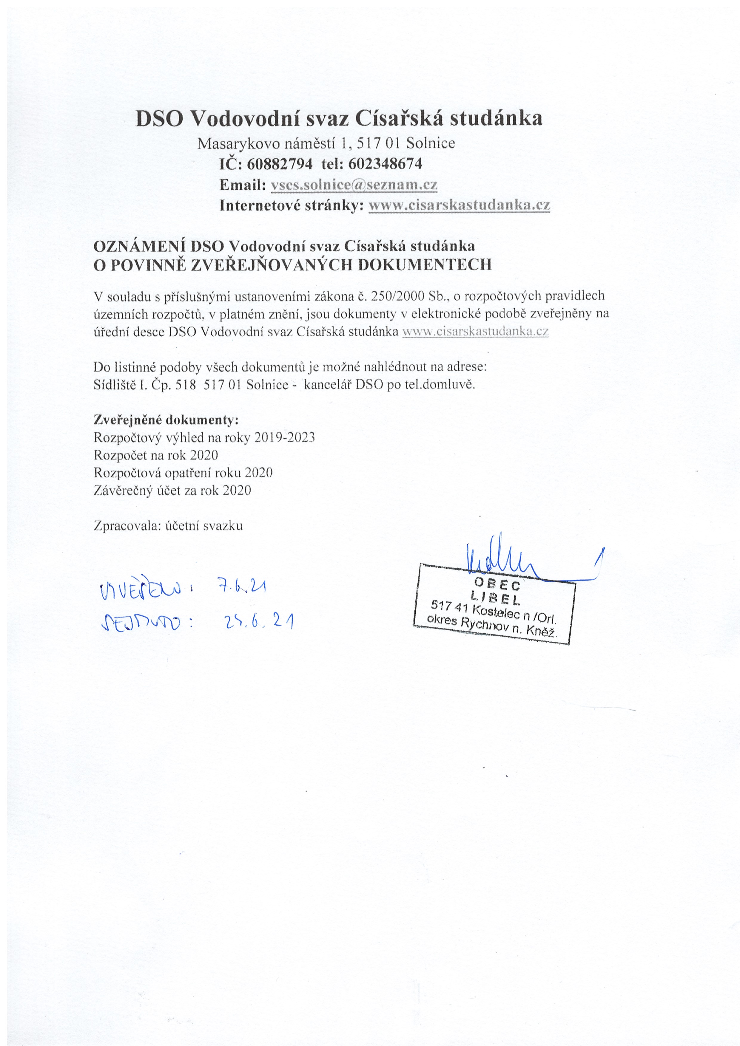 07.06 - 24.06.2021 Oznámení DSO Vodovodní svaz Císařská studánka o povinně zveřejňovaných dokumentech