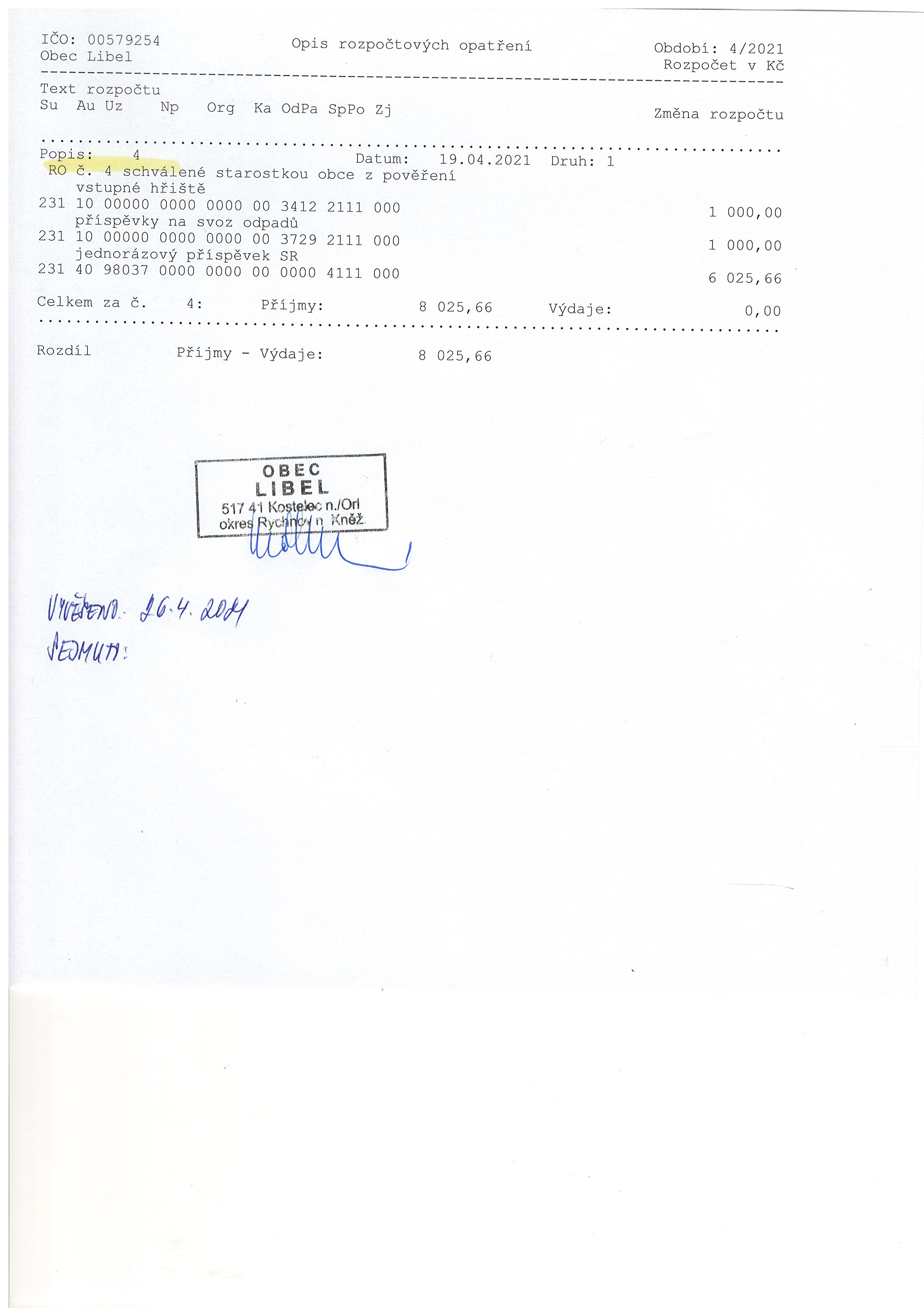 26.04 - 31.12.2021 Rozpočtové opatření č. 4
