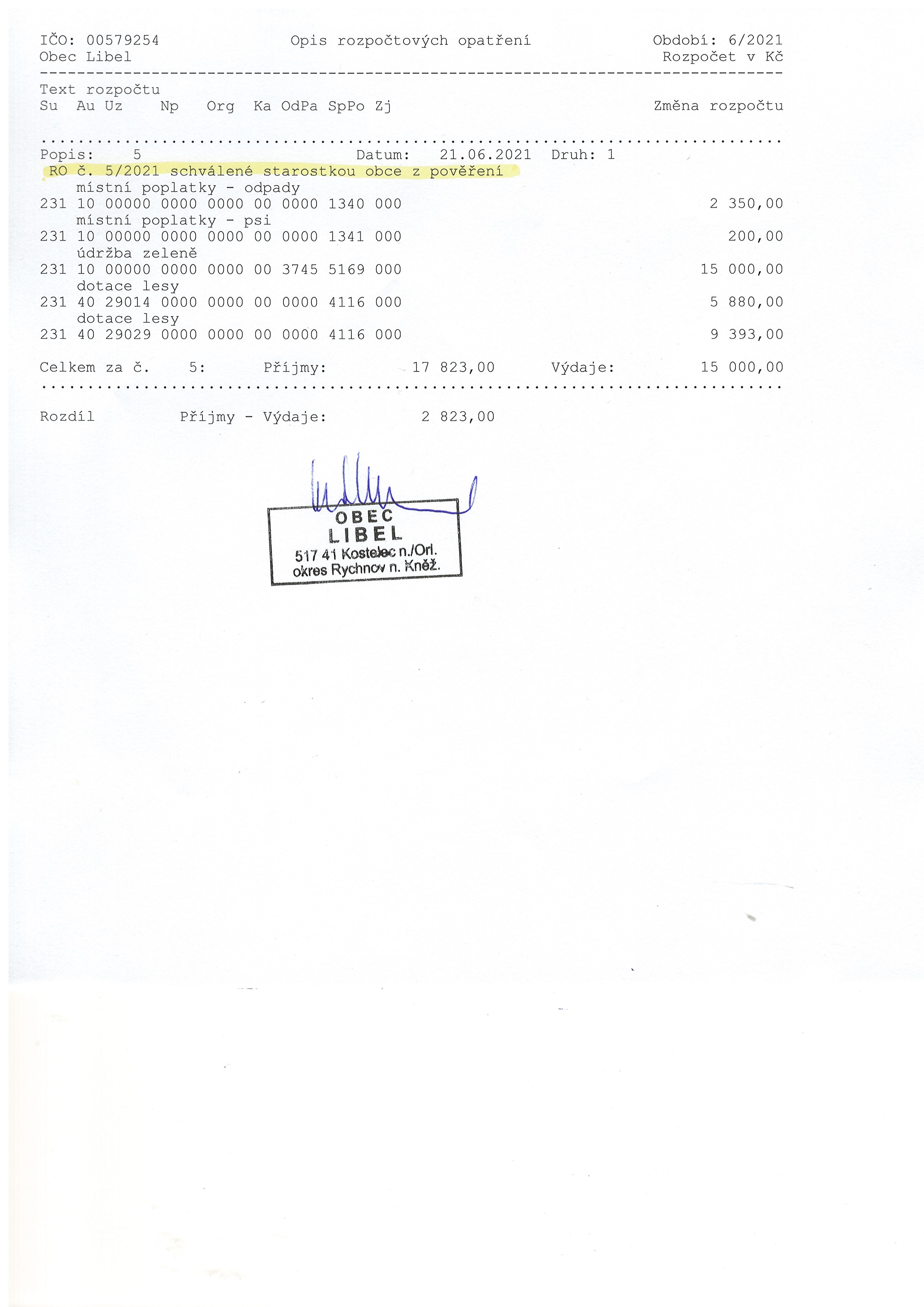 21.06 - 31.12.2021 Rozpočtové opatření č. 5