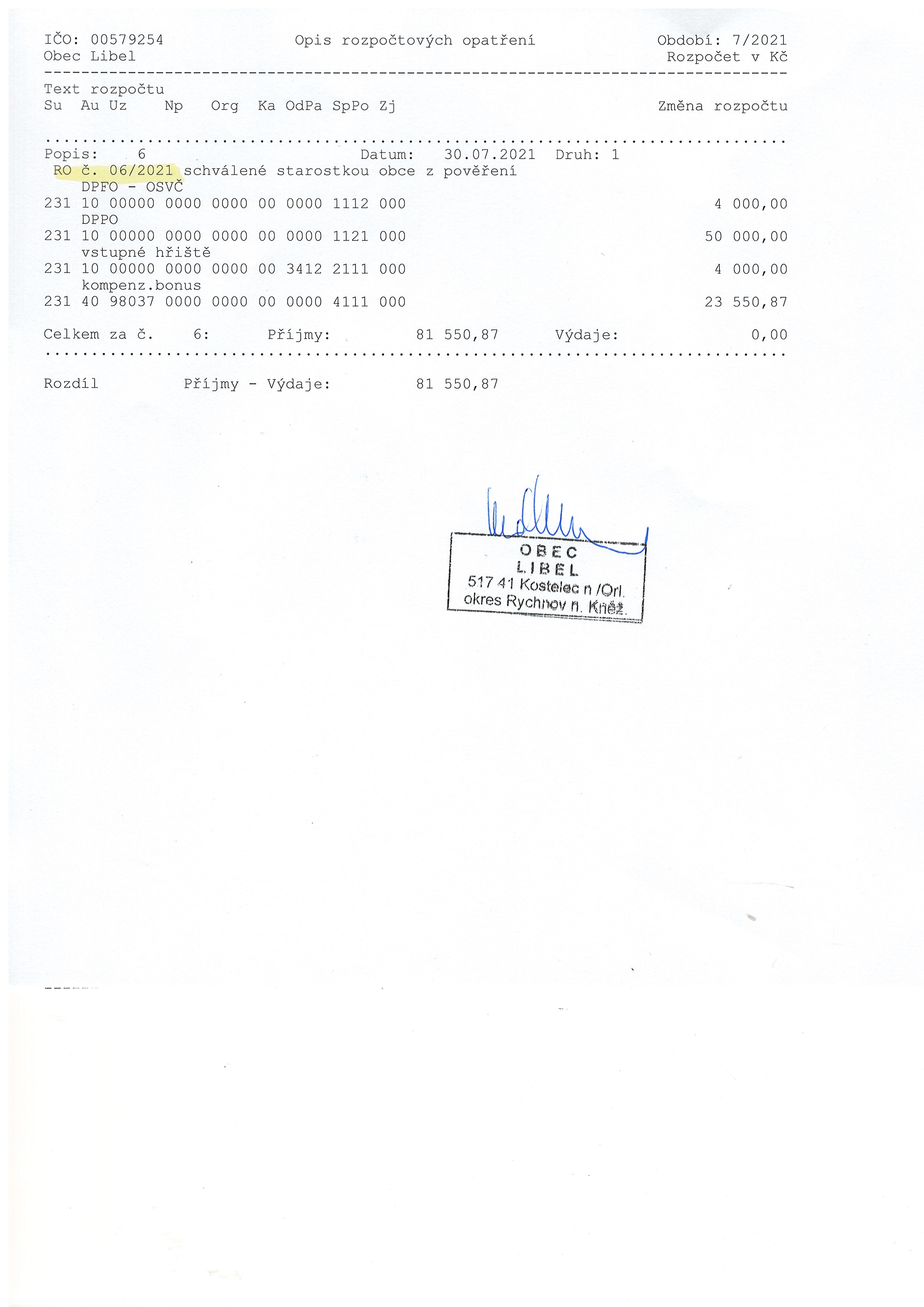 13.08 - 31.12.2021 Rozpočtové opatření č. 6