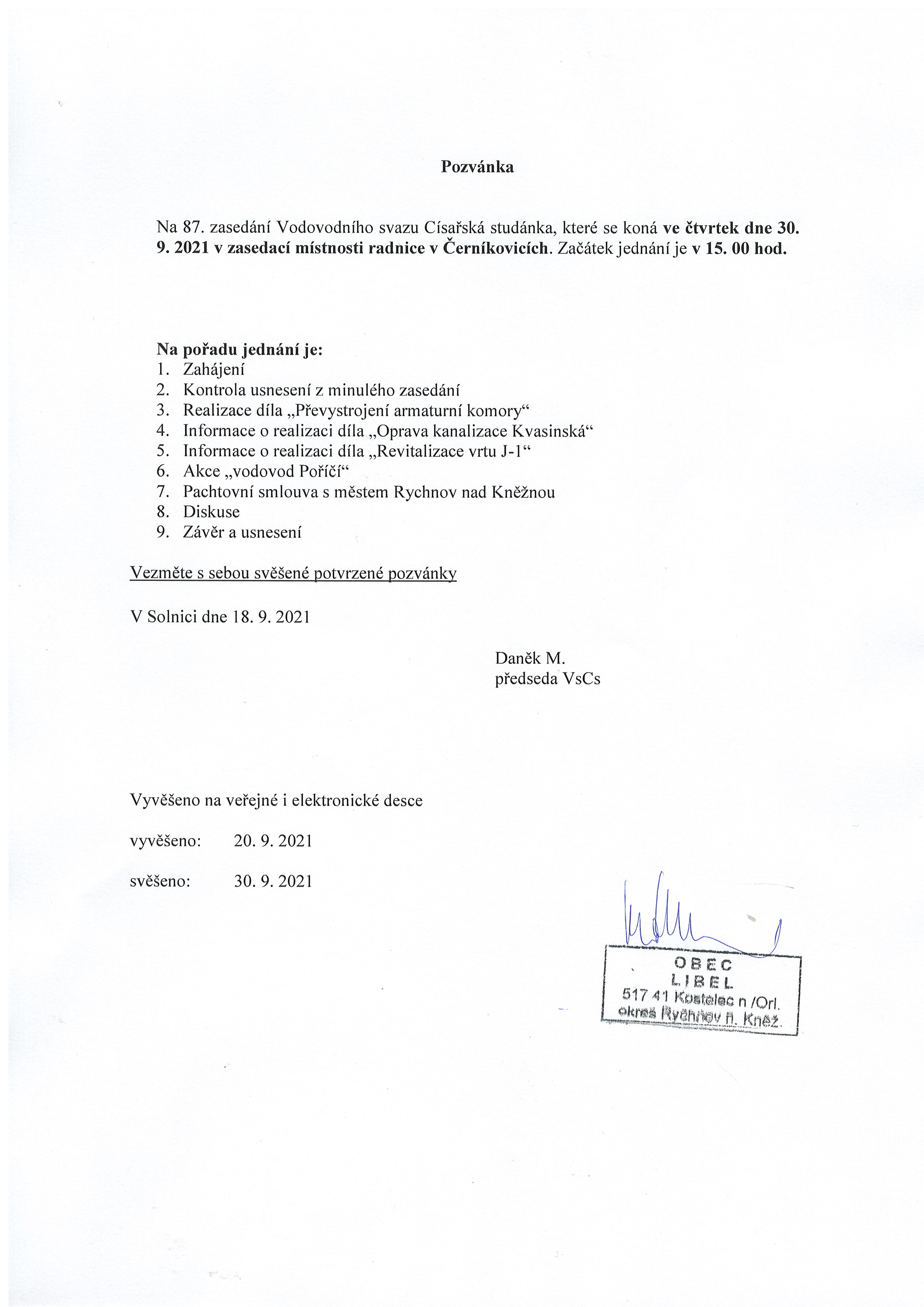 20.09 - 30.09.2021 Pozvánka na 87. zasedání VsCs Solnice