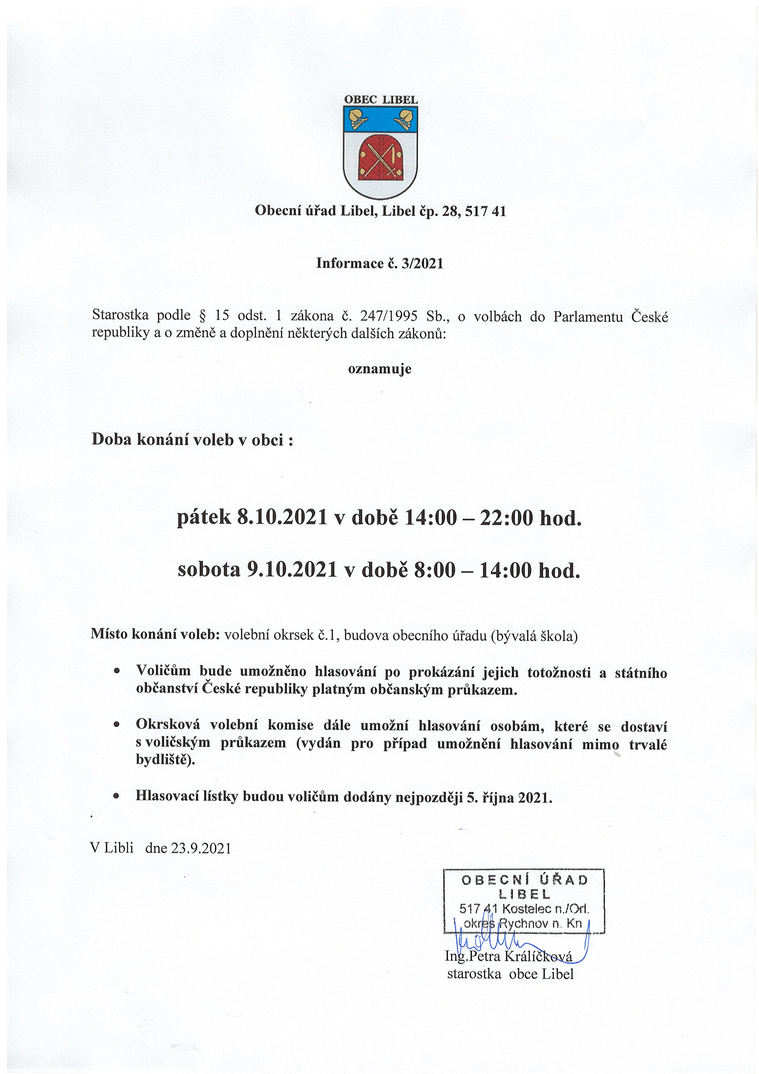 23.09 - 08.10.2021 Oznámení o době a místě konání voleb v Libli