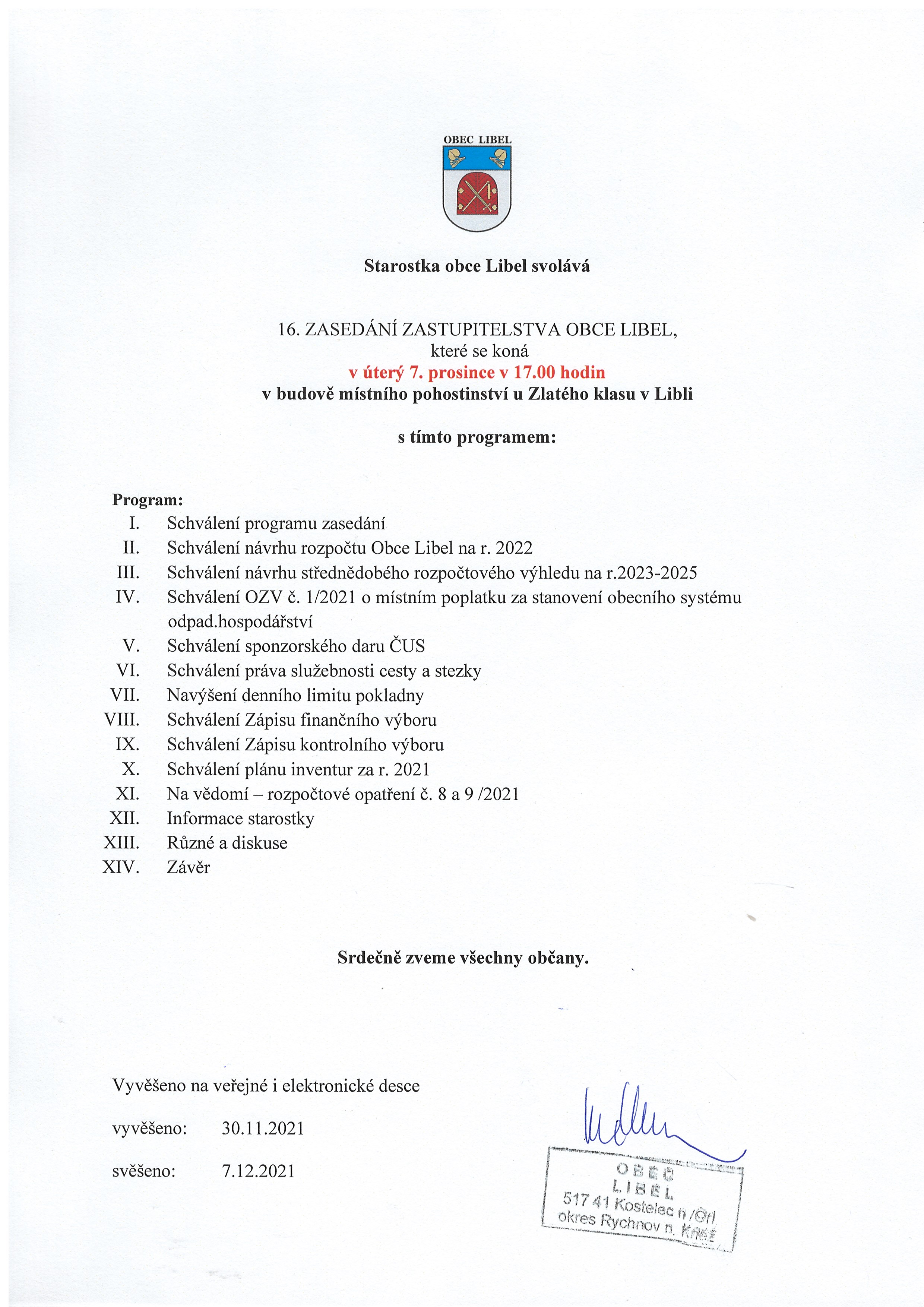 30.11 - 07.12.2021 Pozvánka na 16. zasedání zastupitelstva obce Libel