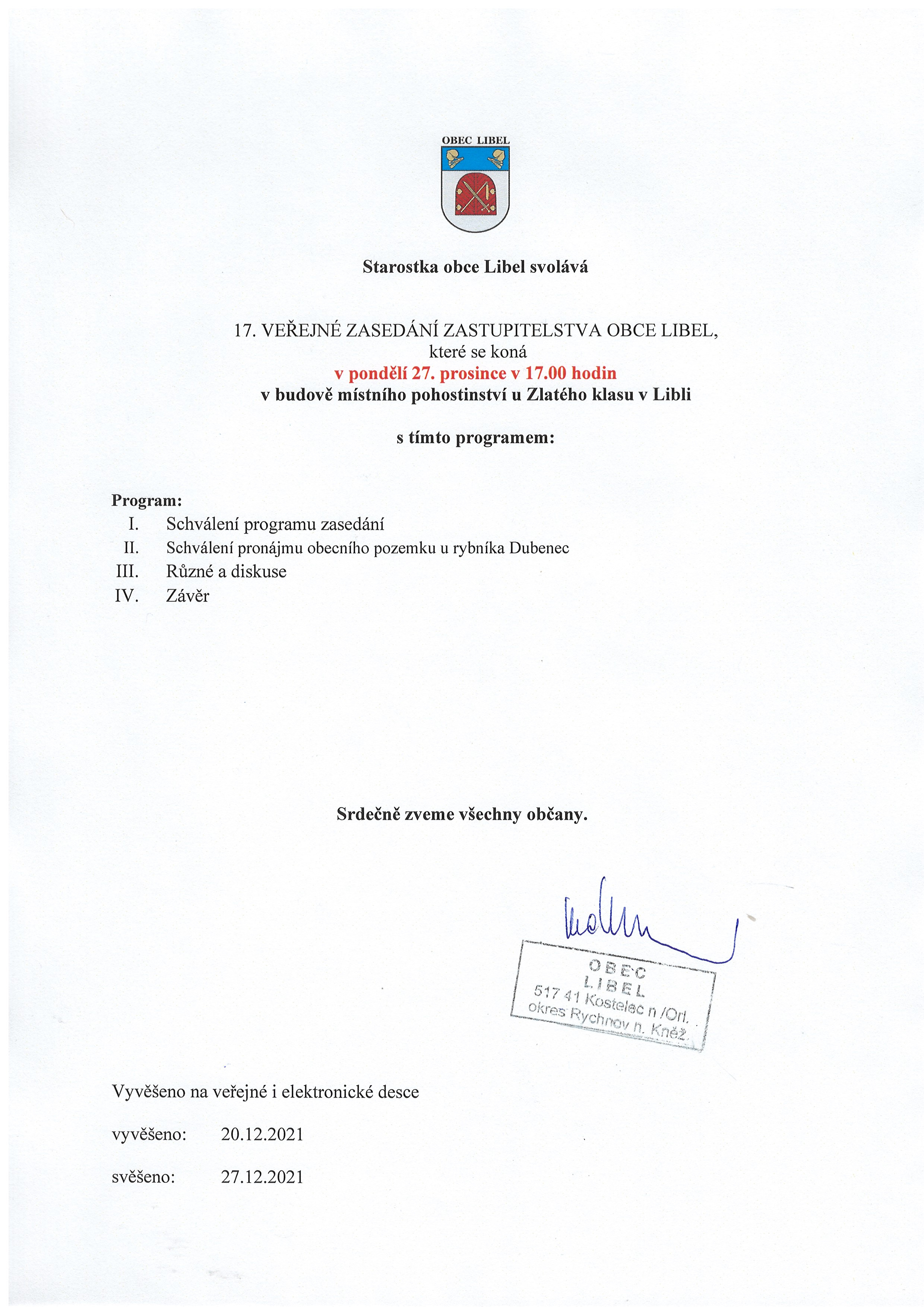 20.12 - 27.12.2021 Pozvánka na 17. veřejné zasedání zastupitelstva obce Libel