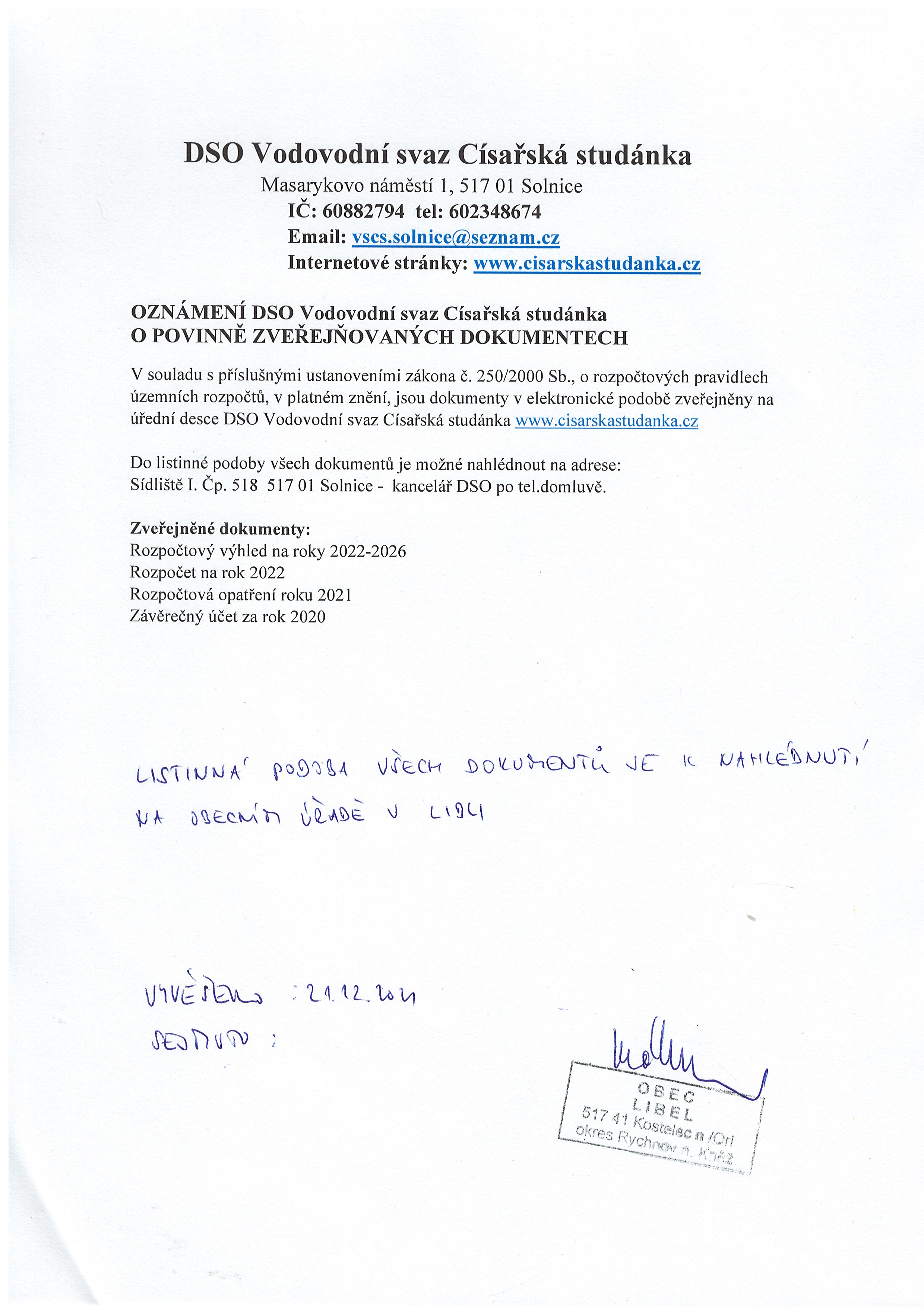 21.12.2021 - 31.12.2022 Oznámení DSO Vodovodní svaz Císařská studánka o povinně zveřejňovaných dokumenetech
