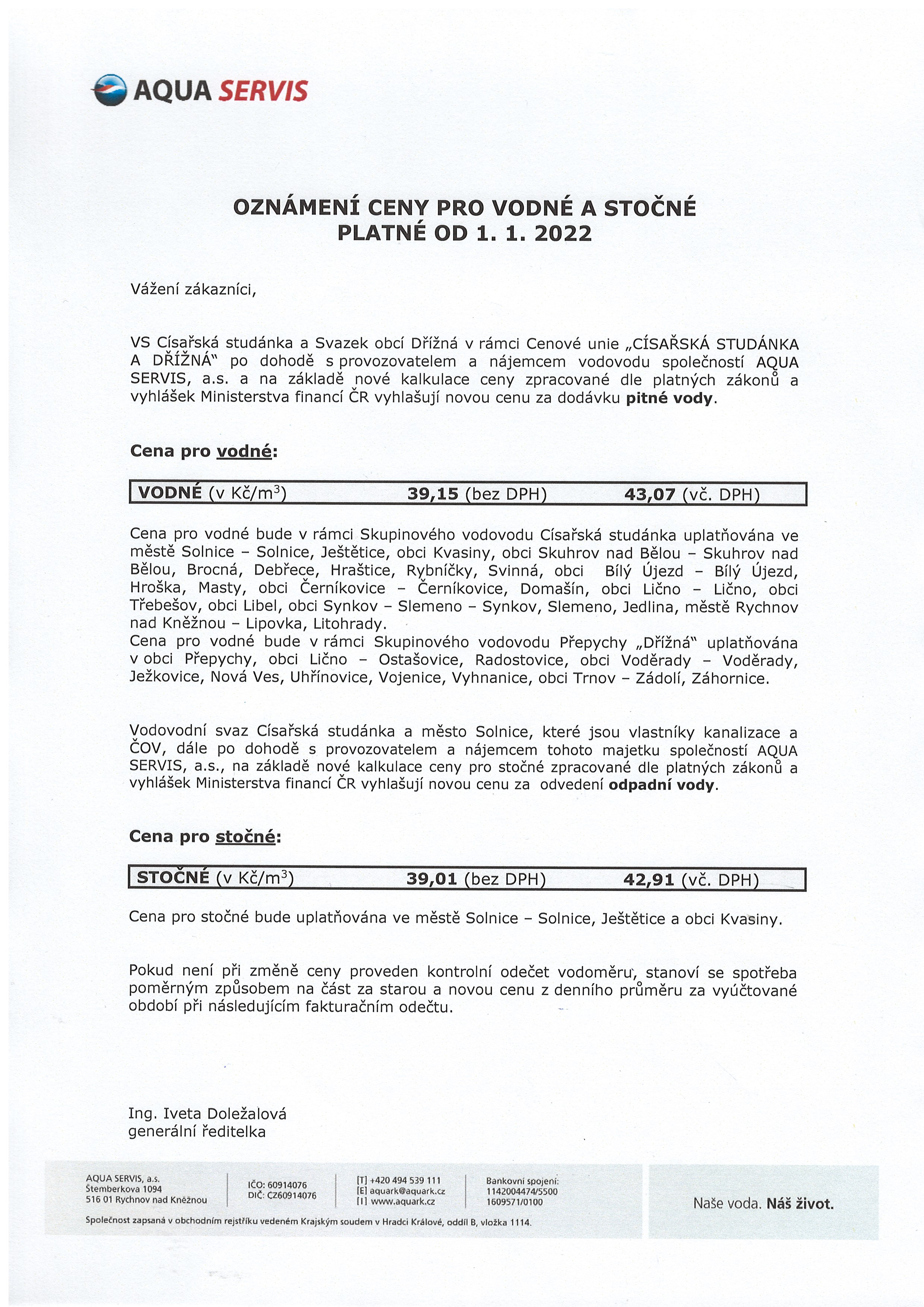22.12.2021 - 31.12.2022 Oznámení ceny pro vodné platné od 1.1.2022